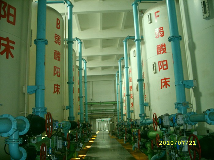 鋼襯膠混床,正常工作時(shí),陰陽離子樹脂按一定比例合在一起進(jìn)一步去除水中溶解性離子,設(shè)計(jì)不同組合其出水電導(dǎo)可達(dá)到1~18M-cm 。均勻混合的樹脂層中,陽樹脂與陰樹脂緊密地交錯(cuò)排列,每一對陽樹脂與陰樹脂顆粒似于一組復(fù)床,混床就象無數(shù)組串聯(lián)運(yùn)行的復(fù)床。通過混合離子交換后進(jìn)入水中的氫離子與氫氧離子會立即生成電離度很低的水分子(H2O),很少可能形成陽離子或陰離子交換時(shí)的反離子,因而能制取純度相當(dāng)高的成品水。